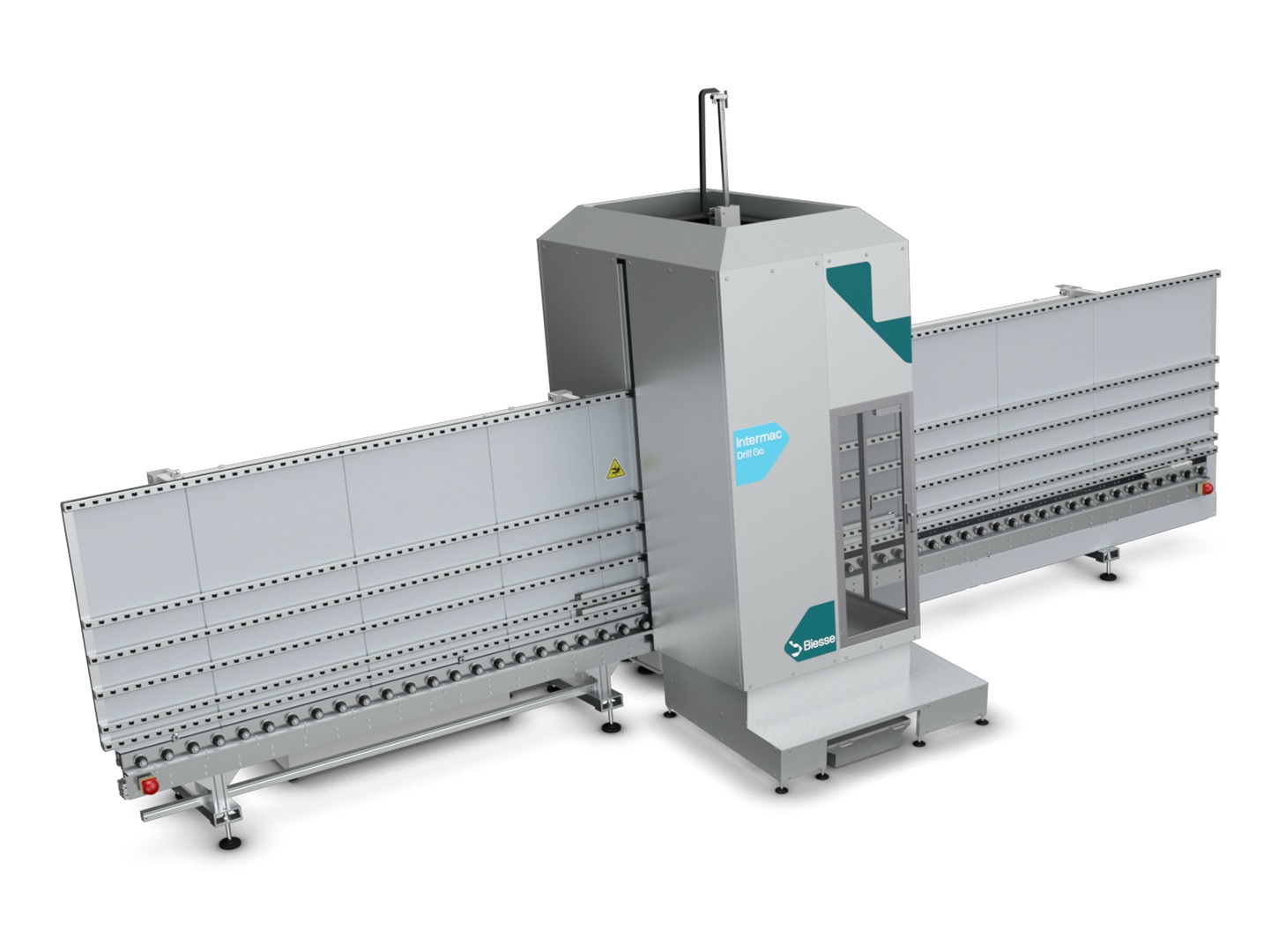 Intermac Drill Go B V er utstyrt med to arbeidsenheter med egne verktøymagasiner (8 verktøy foran og 8 bak), som muliggjør effektiv bearbeiding fra begge sider av glasset. Med integrert CAD/CAM-styring og brukervennlig HMI får operatøren rask programmering, stabil drift og høy produksjonskapasitet.