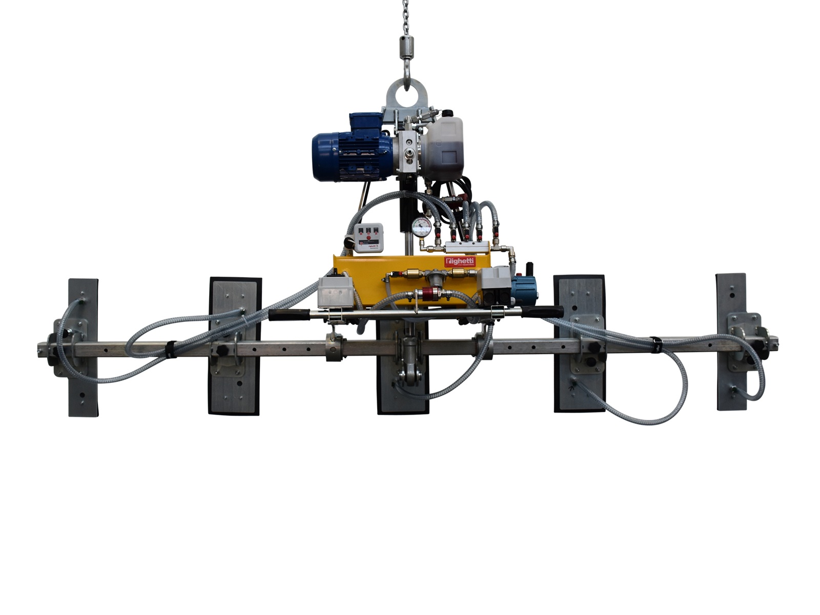 Maskinen er utstyrt med 5 rektangulære sugekopper (580×180 mm) montert på en 2200 mm lang løftebjelke. Hver sugekopp kan roteres 90°, noe som gir fleksibilitet ved plassering og håndtering. Vakuumsystemet inkluderer vakuumtank, tilbakeslagsventil og et effektivt støv- og kondensfilter som beskytter systemet og gir rask oppsuging.